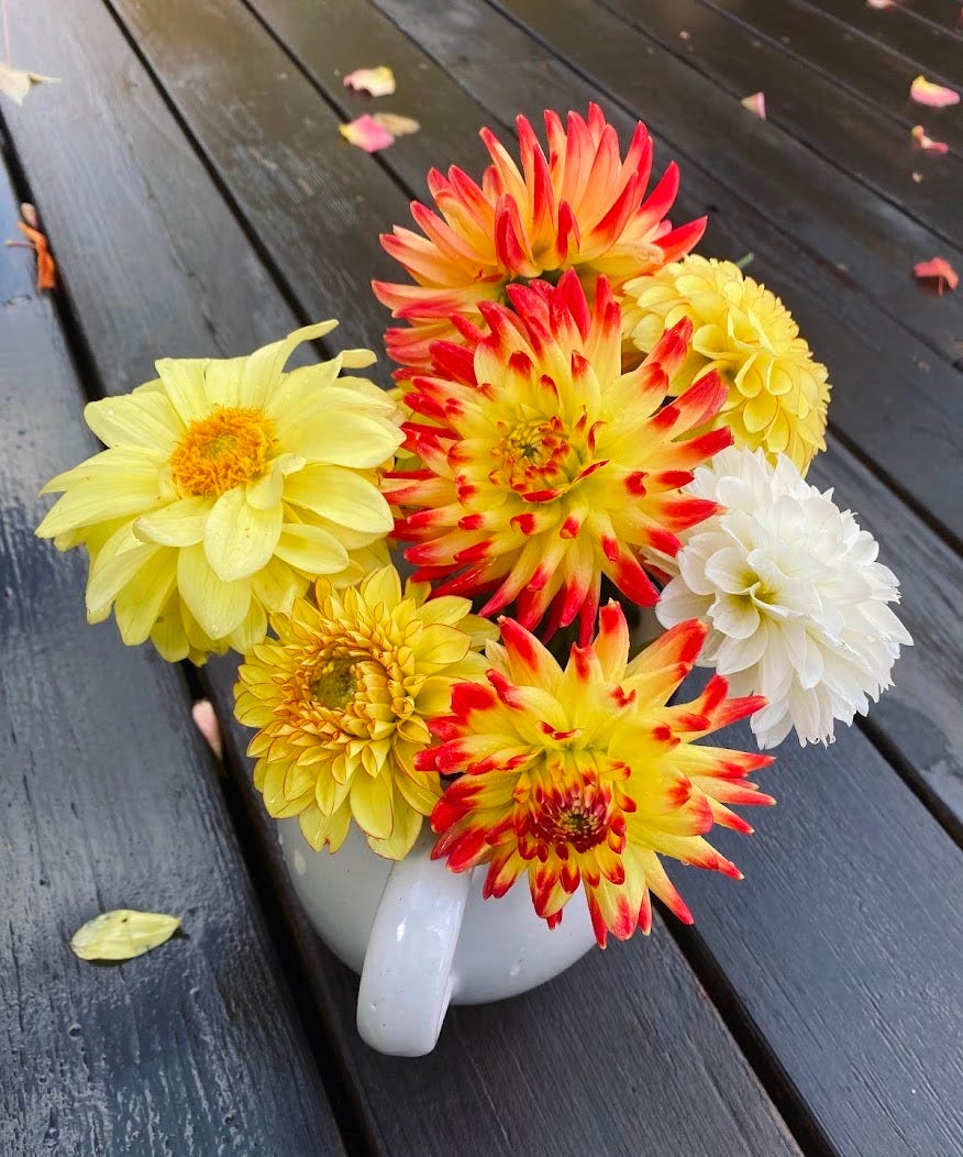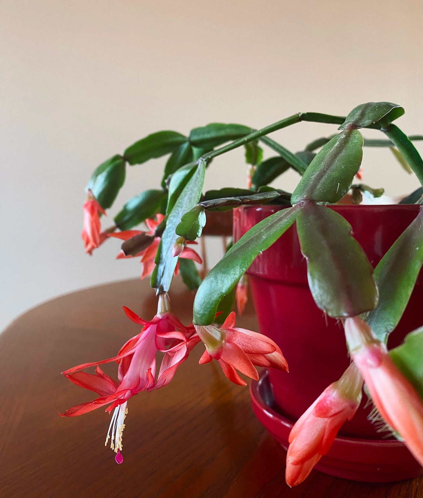 The sky is a forgiving, exhausted pale blue now. The leaves are decomposing in piles by the fences and curbs in a precious gold solstice sun. A propagated Christmas cactus blooms just in time.