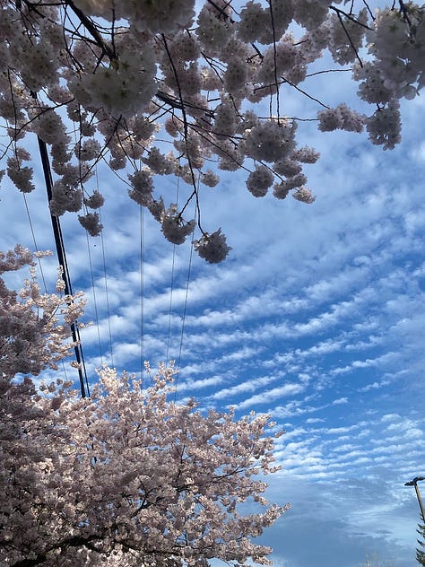 You, too? My friend says she sees prime numbers everywhere: license plates, especially. In the grocery line, a woman discloses that the color yellow seems to follow her, showing up in significant moments of her life. This month, I’ve had my own encounters with nature’s way of patterning. The Fibonacci sequence draws my eye to flower petal fallen to the asphalt. Tessellations in a honeycomb mesmerize me on an early spring walk. Stratocumulus clouds tilt my chin upwards after rain one afternoon.